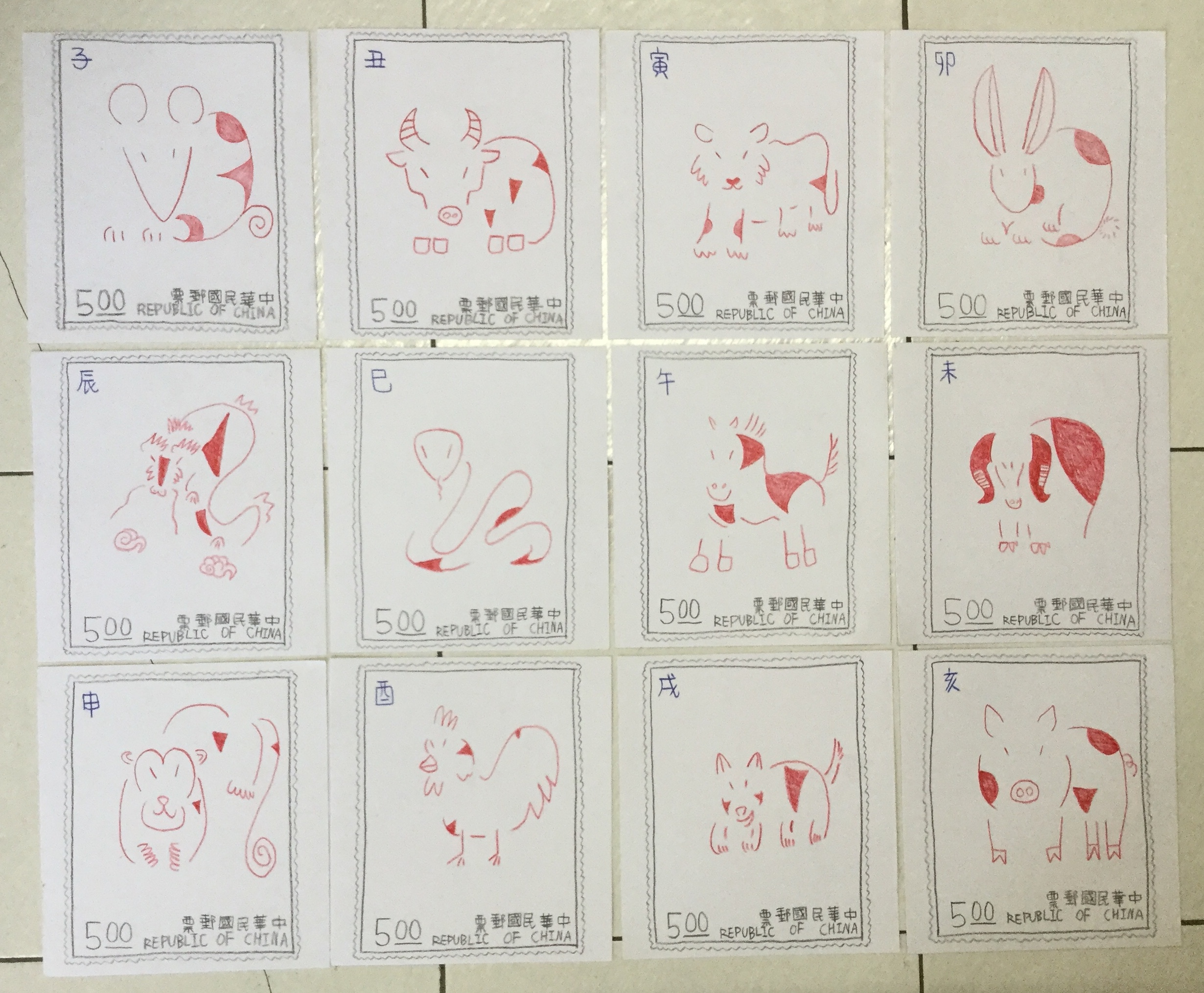 簡介:這是一組在咖啡店為一位非常喜愛集郵的客戶現場設計的十二生肖郵票。